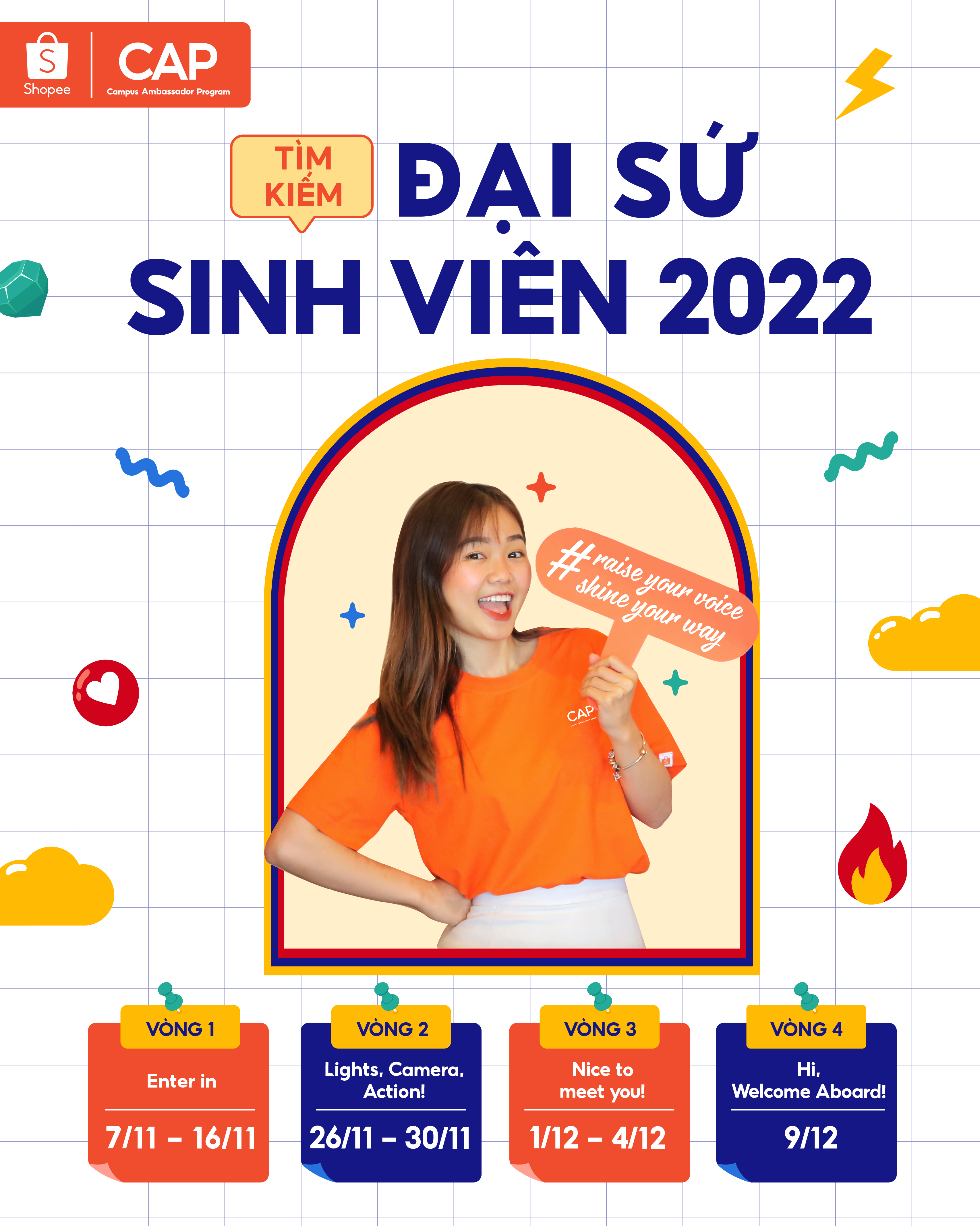 Shopee Campus Ambassador Program (CAP) 2022 là chương trình tìm kiếm đội ngũ Đại sứ Sinh viên với lộ trình 08 tháng đồng hành cùng Shopee Việt Nam.