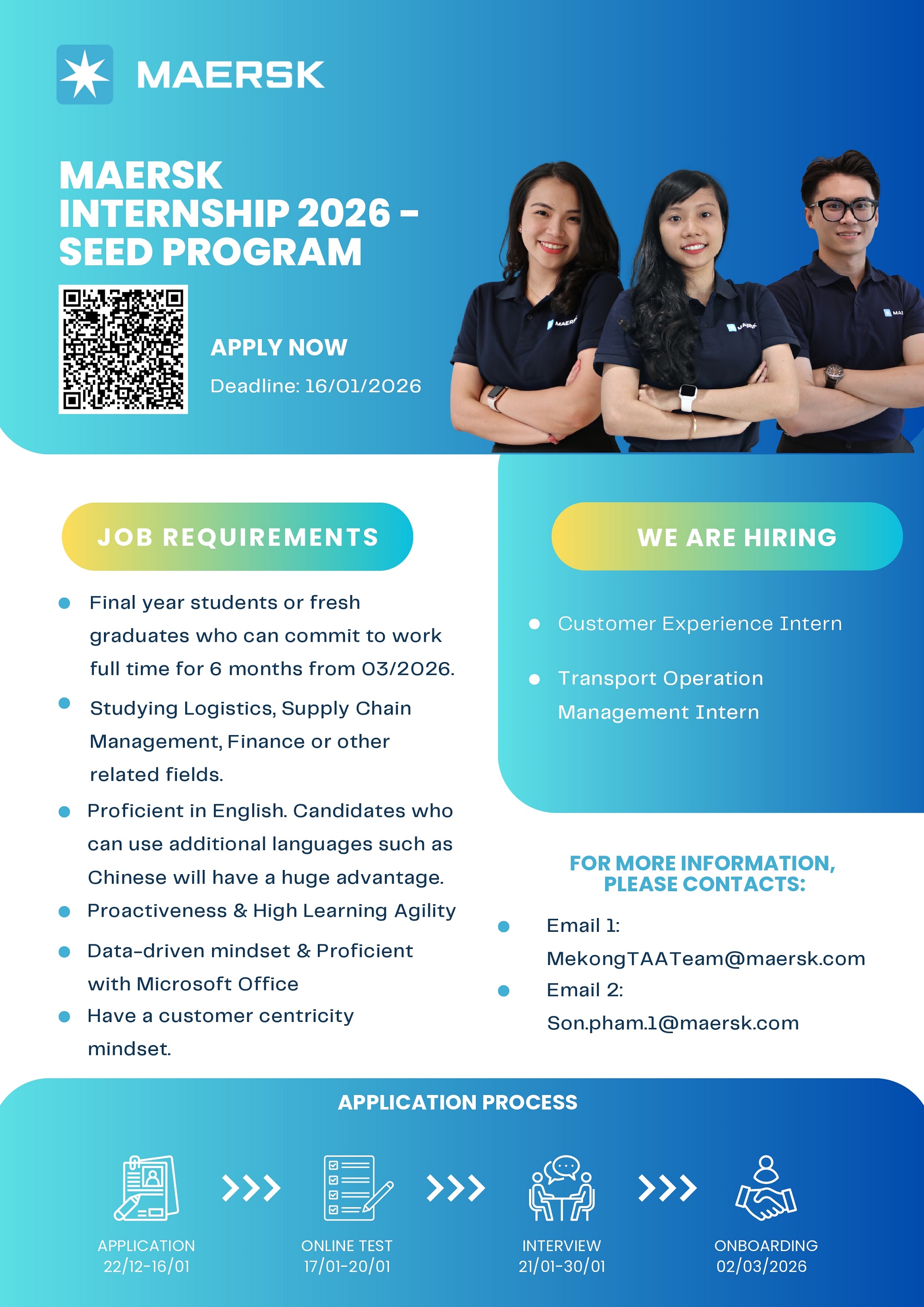 Welcome to our 6-month Internship Program at Maersk Vietnam, where we connect talent with opportunity in the dynamic world of logistics! This program is designed to offer aspiring professionals a hands-on experience in supply chain management, warehousing, transportation, operational excellence and much more.