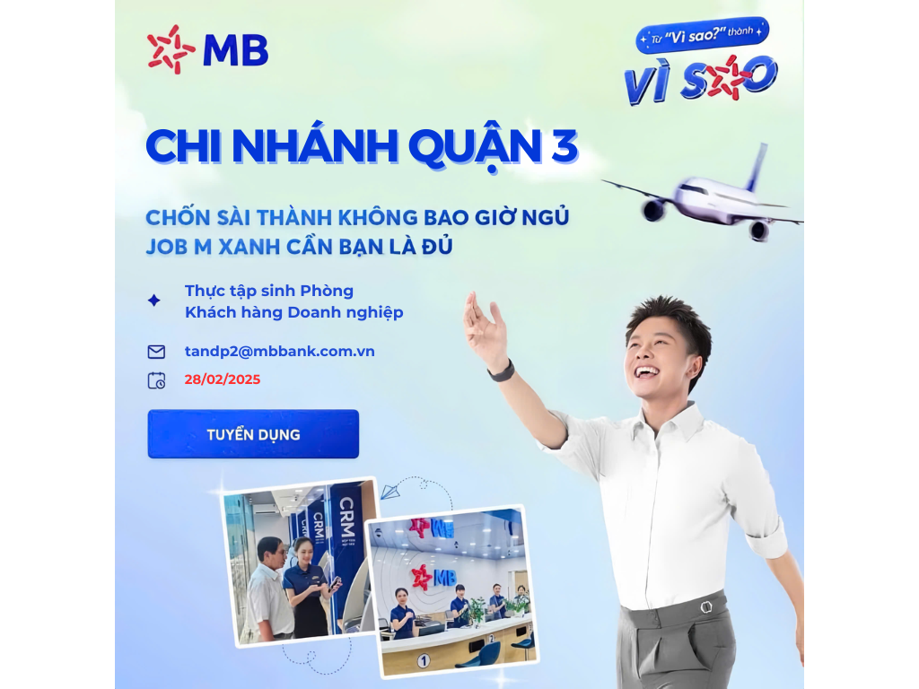 Ứng viên nộp CV trực tiếp qua email: tandp2@mbbank.com.vn - Tiêu đề email: MB QUẬN 3_[TTS]_HỌ VÀ TÊN
