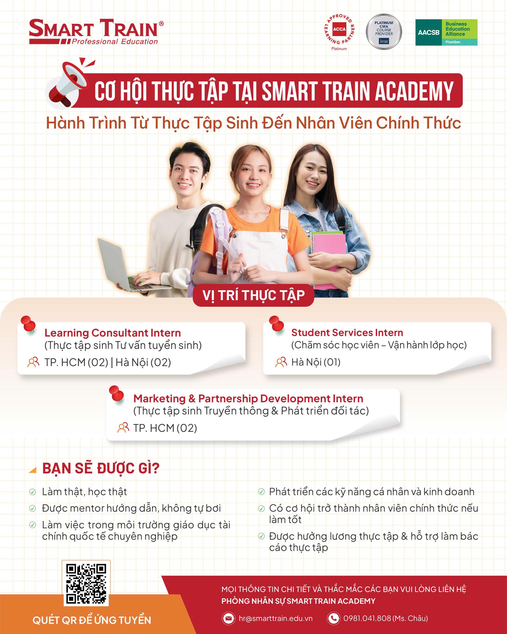 Mọi thông tin chi tiết và thắc mắc các bạn vui lòng liên hệ Ms. Châu thông qua SĐT/Zalo: 0981.041.808 hoặc email: hr@smarttrain.edu.vn.